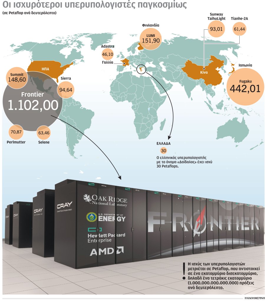 Αυτή τη στιγμή, τον μεγαλύτερο υπερυπολογιστή, με το όνομα Frontier, διαθέτουν οι ΗΠΑ: είναι σε θέση να πραγματοποιήσει 1 δισεκατομμύριο πράξεις κινητής υποδιαστολής ανά δευτερόλεπτο. Το τρίτο μεγαλύτερο σούπερ κομπιούτερ (Lumi) βρίσκεται στη Φινλανδία και η θερμότητα που θα απορρίπτει θα καλύπτει το 20% των αναγκών θέρμανσης της πόλης Kajaani. Η ποσότητα ενέργειας που παράγει αντιστοιχεί σε αυτήν που παράγουν 4.000-5.000 αυτοκίνητα. H Ελλάδα, παρά την πρόοδο που έχει πραγματοποιήσει, επενδύει με σχετική καθυστέρηση στην ανάπτυξη συστημάτων υπερυπολογιστών.