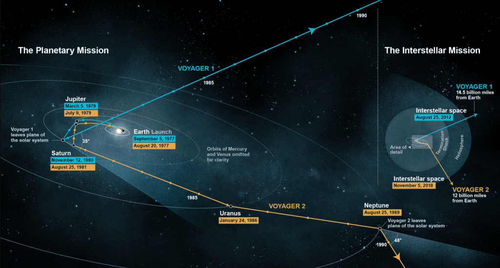Τον Αύγουστο του 2012, το Voyager 1, που εκτοξεύτηκε στις 5 Σεπτεμβρίου 1977, είχε γράψει ιστορία όταν έγινε το πρώτο ανθρώπινο αντικείμενο που βγήκε από το Ηλιακό Σύστημα, σε απόσταση 122 AU από τον Ήλιο, ξεκινώντας έτσι επίσημα την «Διαστρική Αποστολή Voyager». Το Voyager 2, που εκτοξεύτηκε στις 20 Αυγούστου 1977, και είναι το μόνο διαστημικό σκάφος που πλησίασε και φωτογράφησε τους τέσσερις πλανήτες: τον Δία, τον Κρόνο, τον Ουρανό και τον Ποσειδώνα.