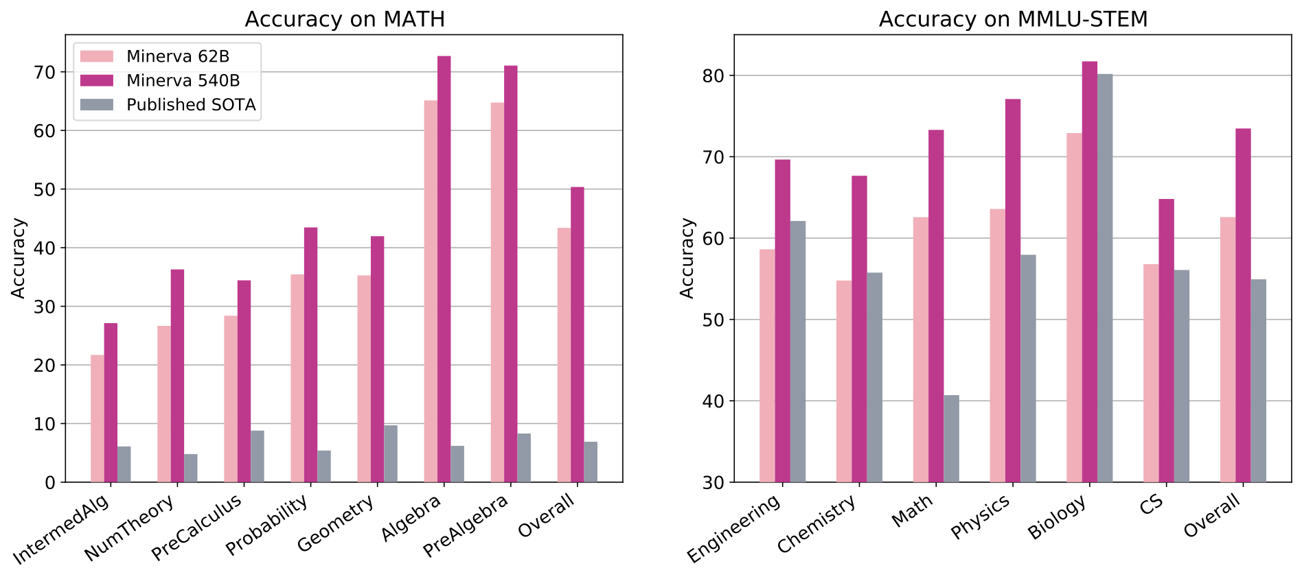 Το σύστημα τεχνητής νοημοσύνης Minerva εξετάστηκε σε προβλήματα μαθηματικών, φυσικής κ.ά., με επίπεδο δυσκολίας μαθημάτων Λυκείου ή πρώτου έτους σπουδών έως και μεταπτυχιακού επιπέδου. Στις περισσότερες των περιπτώσεων, το Minerva πέρασε με μεγάλη επιτυχία τις εξετάσεις: