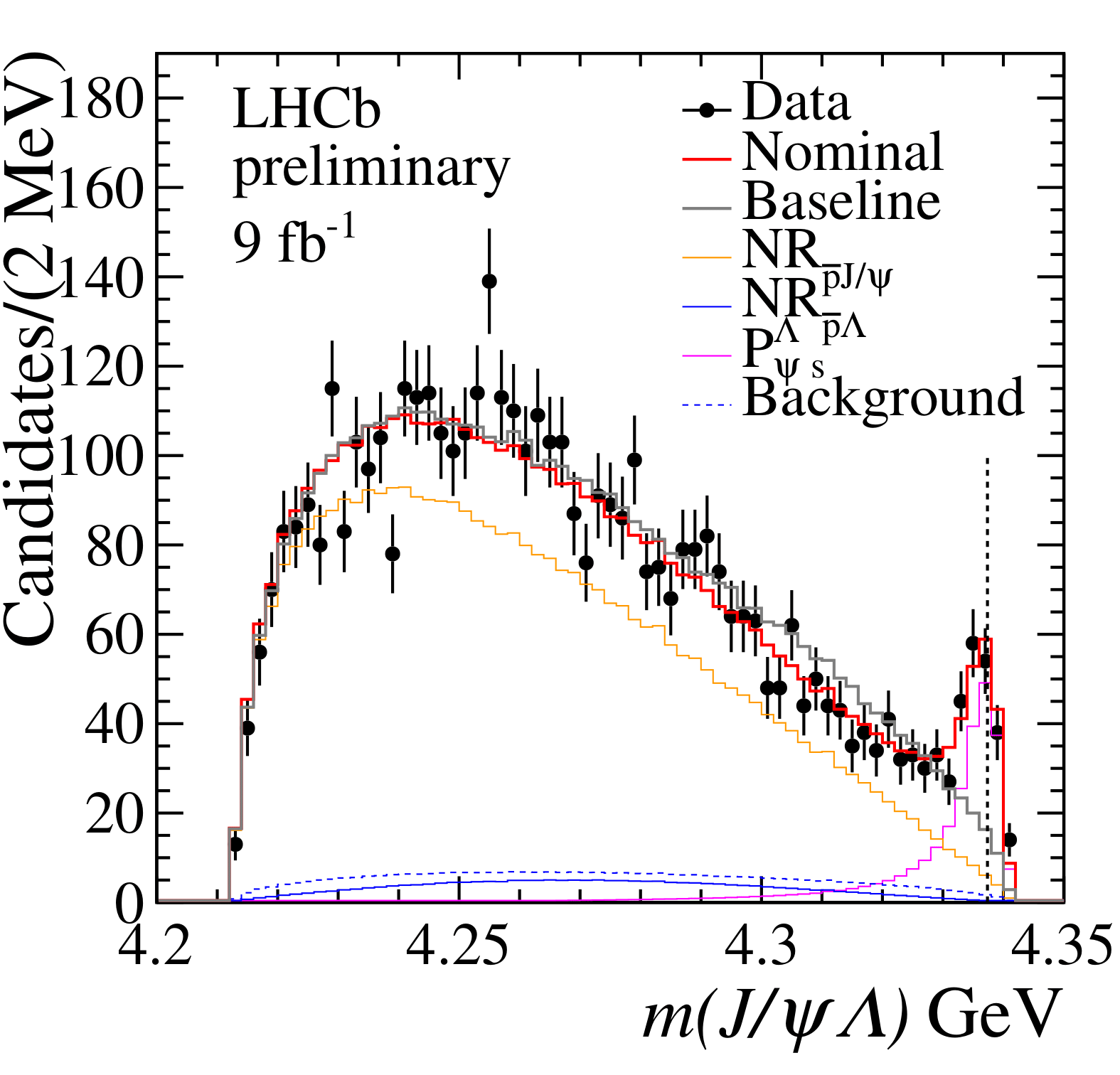 Οι τωρινές ανακαλύψεις που ανακοίνωσε η συνεργασία LHCb περιλαμβάνουν νέα είδη εξωτικών αδρονίων. Το πρώτο είδος, που παρατηρήθηκε σε μια ανάλυση «διασπάσεων» αρνητικά φορτισμένων μεσονίων Β, είναι το πεντακουάρκ PΛψs(4338)0 που συνίσταται από ένα γοητευτικό κουάρκ και ένα γοητευτικό αντικουάρκ, ένα πάνω και ένα κάτω κουάρκ και ένα παράξενο κουάρκ. Είναι το πρώτο πεντακουάρκ που βρέθηκε να περιέχει ένα παράξενο κουάρκ. Η στατιστική ακρίβεια του ευρήματος είναι 15 σίγμα, πολύ περισσότερο από τα 5 σίγμα που απαιτούνται για να διεκδικήσουμε την παρατήρηση ενός σωματιδίου στη σωματιδιακή φυσική.