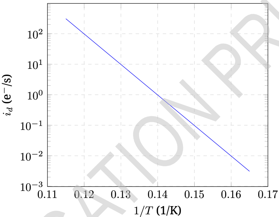 Η απορρόφηση ενός φωτονίου από την κάμερα CCD προκαλεί εκπομπή ενός ηλεκτρονίου εντός της συσκευής. Αυτό συμβαίνει μόνο όταν το φωτόνιο έχει επαρκή ενέργεια για να διεγείρει ένα ηλεκτρόνιο πάνω από το ενεργειακό χάσμα ΔΕg. Να υποθέσετε ότι κάθε φωτόνιο με επαρκή ενέργεια τα καταφέρνει. Διαμέσου του χάσματος, υπάρχει διαρροή ηλεκτρονίων η οποία προκαλείται λόγω της θερμοκρασίας της κάμερας CCD. Το ρεύμα αυτό ονομάζεται ρεύμα σκότους 𝑖𝑑 και μετριέται σε πλήθος ηλεκτρονίων ανά δευτερόλεπτο. Το ρεύμα σκότους είναι συνάρτηση της θερμοκρασίας σύμφωνα με τη σχέση: