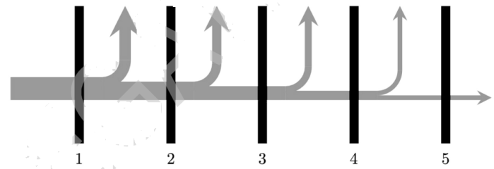 Σχηματική αναπαράσταση της ροής ενέργειας: οι κάθετες γραμμές (σκούρου χρώματος) είναι τα φύλλα, η ροή της ενέργειας (γκρι χρώμα) είναι από αριστερά προς τα δεξιά, ωστόσο, μεταξύ των φύλλων, μέρος της ενέργειας ρέει προς τα πάνω και έξω στο διάστημα.