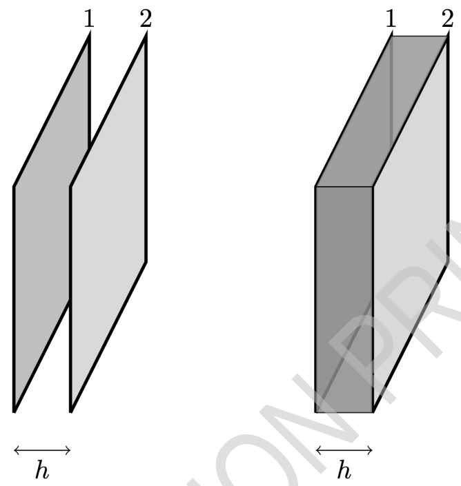Στα αριστερά εικονίζεται ένα απλό μοντέλο δύο γειτονικών φύλλων, 1 και 2 που απέχουν κατά h. Τα φύλλα δεν συνδέονται και η περίμετρος είναι ανοικτή στο διάστημα. Να υποθέσετε ότι τα φύλλα βρίσκονται σε παράλληλα επίπεδα. Τα φύλλα μπορούν να ανταλλάσσουν θερμική ακτινοβολία, η οποία μπορεί επσης να διαφεύγει από το διάκενο στην περίμετρο. Στο δεξί στιγμιότυπο το διάκενο εμφανίζεται σκιασμένο για λόγους οπτικοποίησης.