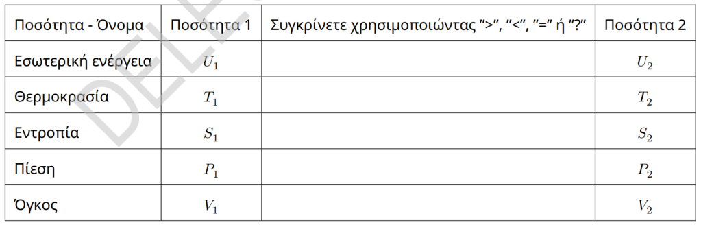 D.1 Να θεωρήσετε ότι ένα mole αερίου περνάει από αριστερά προς τα δεξιά μέσα από το πώμα. Να συμπληρώστε τον πίνακα στο Φύλλο Απαντήσεων χρησιμοποιώντας τα σύμβολα: ”>” ή ”<” για να προσδιορίσετε την ποσότητα που πρέπει να είναι μεγαλύτερη, ”=” για να προσδιορίσετε τις ποσότητες που πρέπει να είναι ίσες ή ”?” αν αδυνατούμε να αποφανθούμε χωρίς περισσότερες πληροφορίες. (1 μονάδα)
