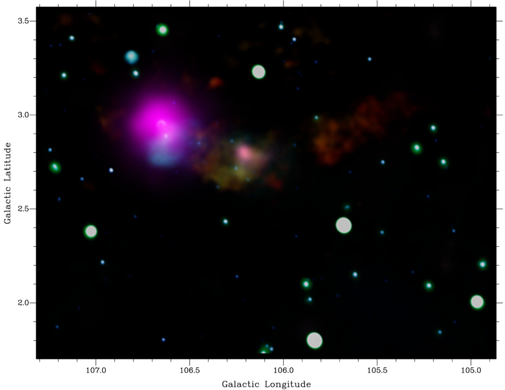 Η Ke Fang και οι συνεργάτες της από το πανεπιστήμιο του Wisconsin-Madison μελέτησαν το υπόλειμμα σπουπερνόβα G106.3 + 2.7, σε απόσταση περίπου 2600 έτη φωτός από τη Γη, αναζητώντας έναν μηχανισμό που θα μπορούσε να εξηγήσει τόσο την ακτινοβολία γάμμα που ανιχνεύται από το Fermi-LAT όσο και τις ακτίνες Χ και ραδιοκύματα που μετρήθηκαν από άλλα παρατηρητήρια. Βρήκαν πως τα δεδομένα αποδεικνύουν ότι το G106.3 + 2.7 είναι PeVatron, καθώς είναι ασύμβατα με την αντίστροφη σκέδαση Compton.