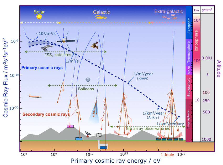 Οι κοσμικές ακτίνες βομβαρδίζουν συνεχώς τη Γη από όλες τις κατευθύνσεις. Το ενεργειακό φάσμα αυτών των σωματιδίων – τα οποία είναι κυρίως πρωτόνια και άλλοι ατομικοί πυρήνες – προσεγγίζεται με παρακάτω λογαριθμικό διάγραμμα. Τα περισσότερα από τα σωματίδια έχουν ενέργειες λίγων GeV (109eV) ή και μικρότερες. Όμως υπάρχουν κοσμικές ακτίνες με ενέργειες της τάξης των TeV (1012eV) (τερα-ηλεκτρονιοβόλτ), και πιο σπάνια πολύ ισχυρότερες, της τάξης τουλάχιστον του ενός PeV ή πετα-ηλεκτρονιοβόλτ (1015eV).