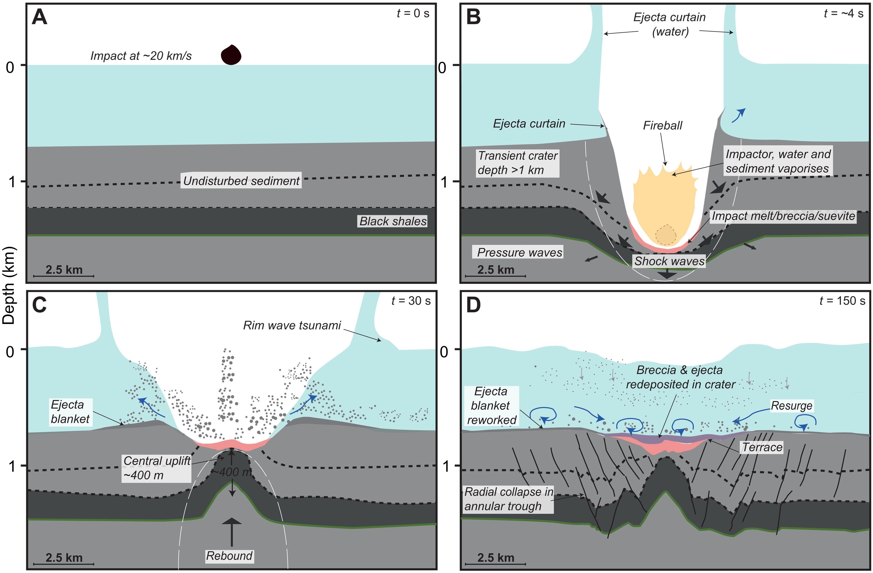 Η σεισμική ανάλυση και η κατοπινή μοντελοποίηση οδηγούν στην εκτίμηση ότι ο αστεροειδής είχε διάμετρο περίπου 400 μέτρων και θα έπεσε -με δύναμη ισοδύναμη έκρηξης 5.000 μεγατόνων ΤΝΤ- σε θάλασσα που θα είχε βάθος 800 μέτρων, προκαλώντας διαδοχικά τεράστια τσουνάμι ύψους έως ενός χιλιομέτρου, σεισμό μεγέθους 6,5 έως 7 βαθμών και πιθανώς απελευθερώνοντας σημαντικές ποσότητες αερίων του θερμοκηπίου από εναποθέσεις άνθρακα στον βυθό.