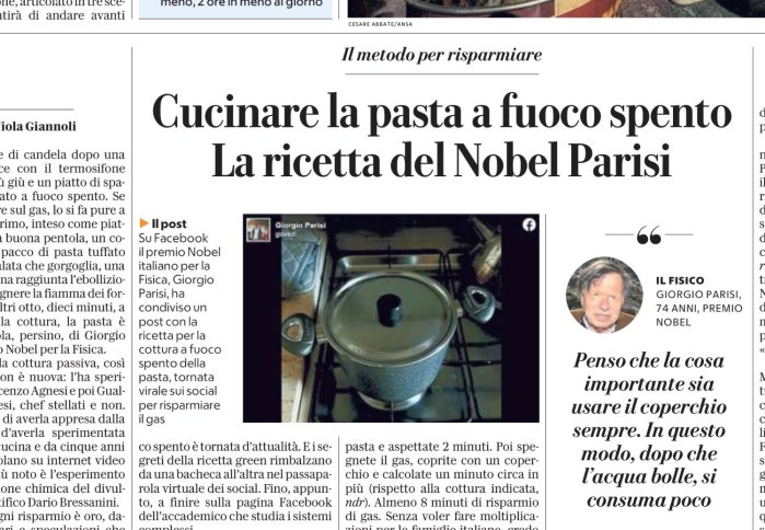 Σύμφωνα με τον Giorgio Parisi, μόλις βράσει το νερό ρίχνουμε τα ζυμαρικά στην κατσαρόλα και στη συνέχεια κλείνουμε το μάτι της κουζίνας, βάζουμε το καπάκι στην κατσαρόλα και περιμένουμε. Το φαγητό θα είναι έτοιμο εξοικονομώντας έτσι τουλάχιστον 8 λεπτά κατανάλωσης ενέργειας.