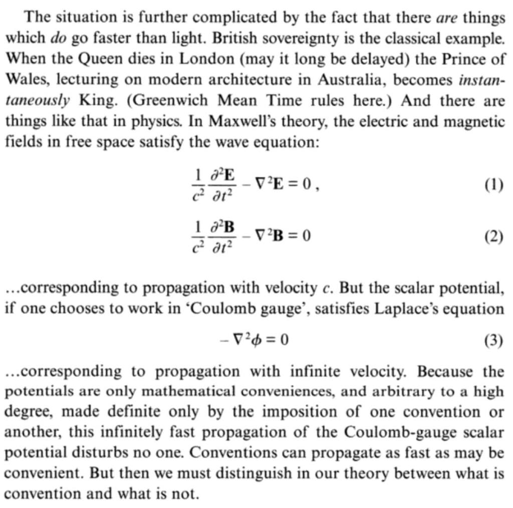 Η «βασιλεία» λοιπόν είναι ένα από τα πράγματα που διαδίδονται με ταχύτητα μεγαλύτερη του φωτός. Συνεχίζοντας ο Bell υπενθυμίζει ότι υπάρχουν τέτοιες έννοιες και στη φυσική, όπως το βαθμωτό δυναμικό, αν διαλέξει κανείς να δουλέψει σε «βαθμίδα Coulomb», το οποίο ικανοποεί την εξίσωση Laplace και αντιστοιχεί σε μια άπειρη ταχύτητα διάδοσης. Αλλά αυτές οι έννοιες (όπως και η βασιλεία) δεν αντιπροσωπεύουν άμεσα κάποιο μετρήσιμο φυσικό μέγεθος.