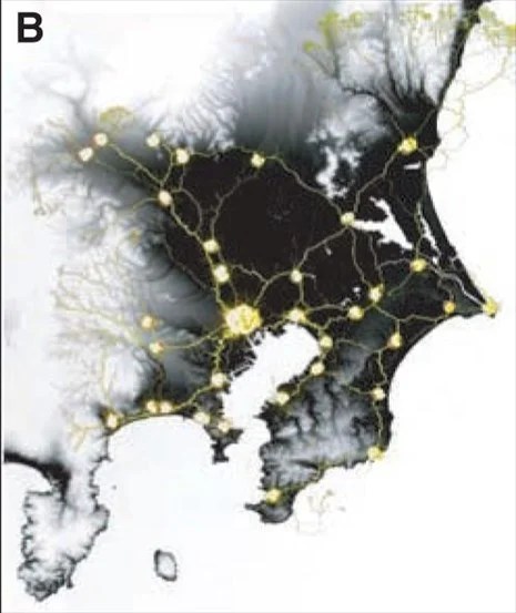 Με βαθύ αισθητικό πνεύμα, το 2010 μία ερευνητική ομάδα της Ιαπωνίας [1] αποφάσισε να θέσει ένα ανθρώπινο ερώτημα στο βλεννομύκητα Physarum polycephalum. Σε ένα δισκίο τοποθέτησαν πηγές τροφής στις θέσεις του Τόκιο και των κοντινών σε αυτό πόλεων, αναπαριστώντας βουνά, λίμνες και θάλασσα με έντονο φωτισμό. Μεταξύ των αναγκών να τραφεί και να τραφεί με ασφάλεια, ο βλεννομύκητας αναπτύχθηκε αναπαριστώντας με μεγάλη ακρίβεια το πραγματικό σιδηροδρομικό δίκτυο στα πέριξ του Τόκιο. Με άλλα λόγια, έλυσε με τον τυφλό και συστηματικό του τρόπο το ίδιο (απλό) πρόβλημα που είχαν λύσει ομάδες πολιτικών μηχανικών.
