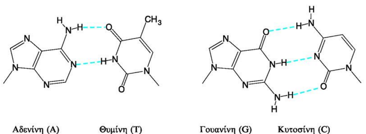 Το DNA είναι ένα δίκλωνο μόριο που σχηματίζει μια διπλή έλικα. Οι δύο κλώνοι ενώνονται μεταξύ τους με δεσμούς υδρογόνου μεταξύ των αζωτούχων βάσεων (A, T, G, C) που περιέχονται στα νουκλεοτίδια. Αδενίνη (Α) και Θυμίνη (Τ) ενώνονται με 2 δεσμούς υδρογόνου, ενώ Γουανίνη (G) και Κυτοσίνη (C) με 3 δεσμούς υδρογόνου. Οι διακεκομένες γραμμές αντιπροσωπεύουν δεσμούς υδρογόνου