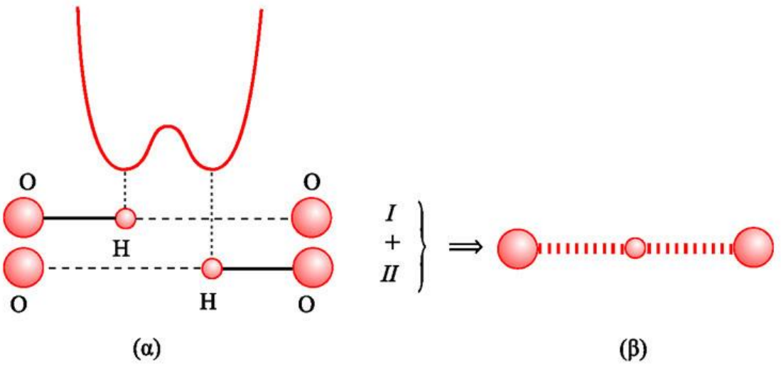 Η ελικοειδής δομή των πρωτεϊνών και το ζευγάρωμα των ‘συζυγών’ βάσεων που δημιουργεί τη διπλή έλικα στο DNA οφείλονται αποκλειστικά σε δεσμούς υδρογόνου των οποίων ο μηχανισμός περιγράφεται από την κβαντική φυσική: Το ελαφρότερο όλων των ατόμων, το υδρογόνο – στην πραγματικότητα ο πυρήνας του – διασχίζει εύκολα την κλασικά απαγορευμένη περιοχή μεταξύ των δυο πηγαδιών του σχήματος (α).Υπό την ταυτόχρονη έλξη δυο ελκτικών κέντρων (δυο οξυγόνων στο σχήμα ή δυο αζώτων ή ενός αζώτου και ενός οξυγόνου κ.ο.κ.) το υδρογόνο εκτελεί μια απεντοπισμένη κίνηση ανάμεσα στα δυο σχετικά πηγάδια εναλλάσσοντας διαρκώς το είδος της «σύνδεσής» του με το κάθε οξυγόνο (βαριά γραμμή διακεκομμένη γραμμή). Έτσι ο δεσμός υδρογόνου είναι τελικά μια κβαντική επαλληλία μεταξύ των μορφών I και II και ένας τρόπος να παρασταθεί αυτό φαίνεται στο σχήμα (β).[Κβαντομηχανική Ι, Στέφανος Τραχανάς]