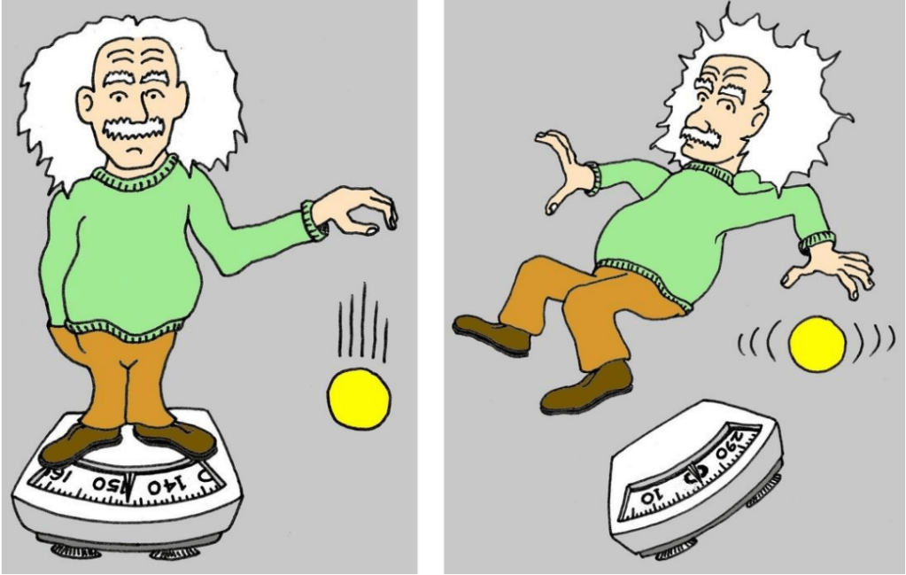 Από την απλή παρατήρηση ότι ένα άτομο που πέφτει ελεύθερα δεν αισθάνεται το βαρυτικό πεδίο προέκυψε το μεγαλύτερο άλμα στην σκέψη του Αϊνστάιν, την συνειδητοποίηση ότι η βαρύτητα μπορεί να είναι ισοδύναμη με την επιτάχυνση. Ότι η βαρύτητα επηρεάζει όλα τα σώματα με τον ίδιο τρόπο επειδή είναι μια ιδιότητα του χωροχρόνου (η καμπυλότητά του) και όχι μια δύναμη που διαδίδεται μέσω του χωροχρόνου (όπως ηλεκτρομαγνητικές ή πυρηνικές δυνάμεις). Όταν εκφράστηκε με τρόπο που είναι ξεκάθαρα ανεξάρτητος από την επιλογή των συντεταγμένων, αυτή η ιδέα εξελίχθηκε στην Γενική Θεωρία της Σχετικότητας.