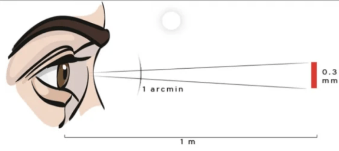 Το ανθρώπινο μάτι έχει πολύ περιορισμένη γωνιακή ανάλυση. Δεν μπορούμε να ξεχωρίσουμε σημεία που απέχουν μεταξύ τους γωνιακή απόσταση 0,02 μοίρες. Αυτό αντιστοιχεί σε παρατήρηση δυο σημείων από απόσταση 30 cm μπροστά από τα μάτια μας που απέχουν μεταξύ τους απόσταση 0,1 mm – περίπου όσο το το πάχος μιας τρίχας. Σε μικρότερη απόσταση τα δυο σημεία επικαλύπτονται.