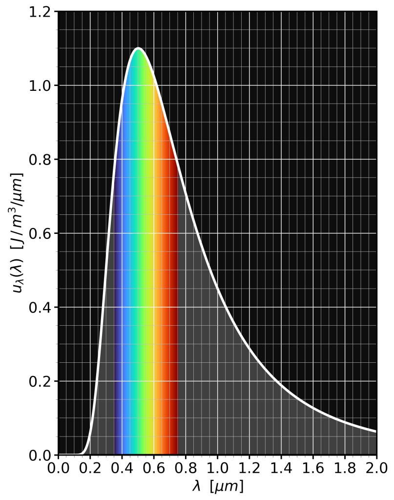 Έτσι, θεωρώντας τον Ήλιο ως μέλαν σώμα με επιφανειακή θερμοκρασία T≈5800K, προκύπτει ότι το μήκος κύματος στο οποίο εκπέμπεται η περισσότερη ποσότητα ακτινοβολία είναι τα 520nm. Ή αν εξετάσουμε την φασματική κατανομή Planck της ακτινοβολίας μέλανος σώματος, τα μήκη κύματος που αντιστοιχούν στο εύρος της κορυφής της ανήκουν στο ορατό φάσμα της ηλεκτρομαγνητικής ακτινοβολίας (από 400nm έως 700nm), όπως ακριβώς δείχνει το διάγραμμα που ακολουθεί: