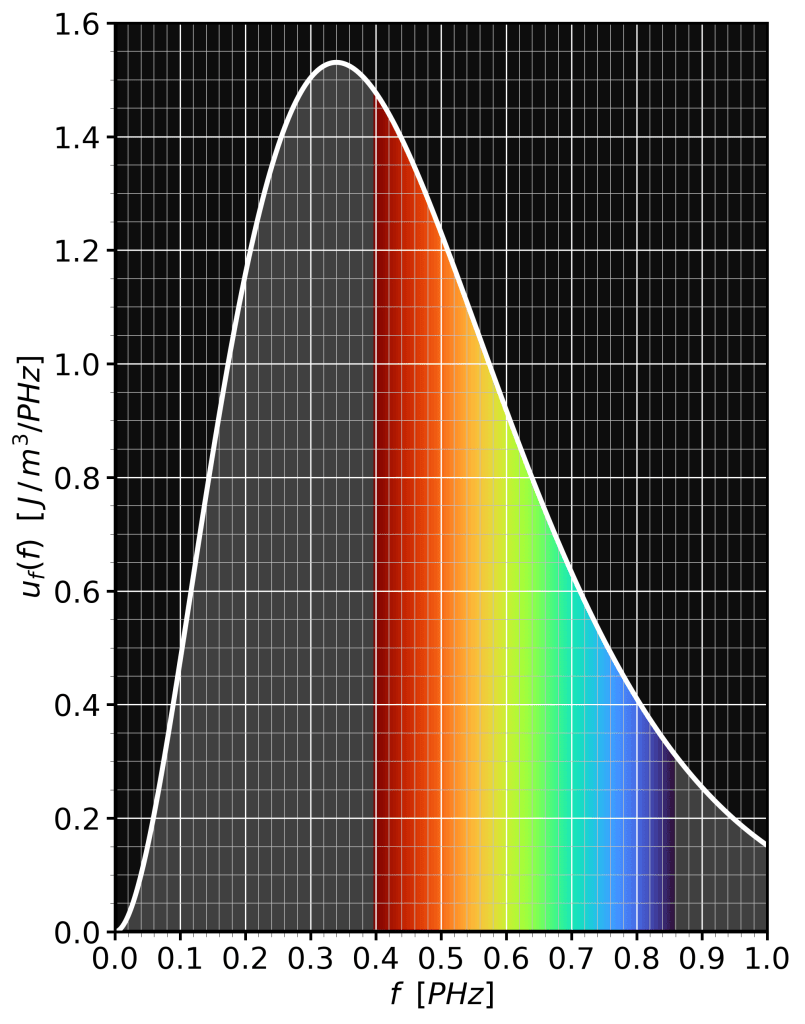 Όμως εδώ βλέπουμε πως η κορυφή στην φασματική κατανομή Planck του μέλανος σώματος σίγουρα δεν αντιστοιχεί στο ορατό φως!! Το μέγιστο αντιστοιχεί στην υπέρυθρη ακτινοβολία και το μέσον του ορατού εύρους είναι μετατοπισμένο στον οριζόντιο άξονα των συχνοτήτων κατά έναν παράγοντα 2 από το μέγιστο.