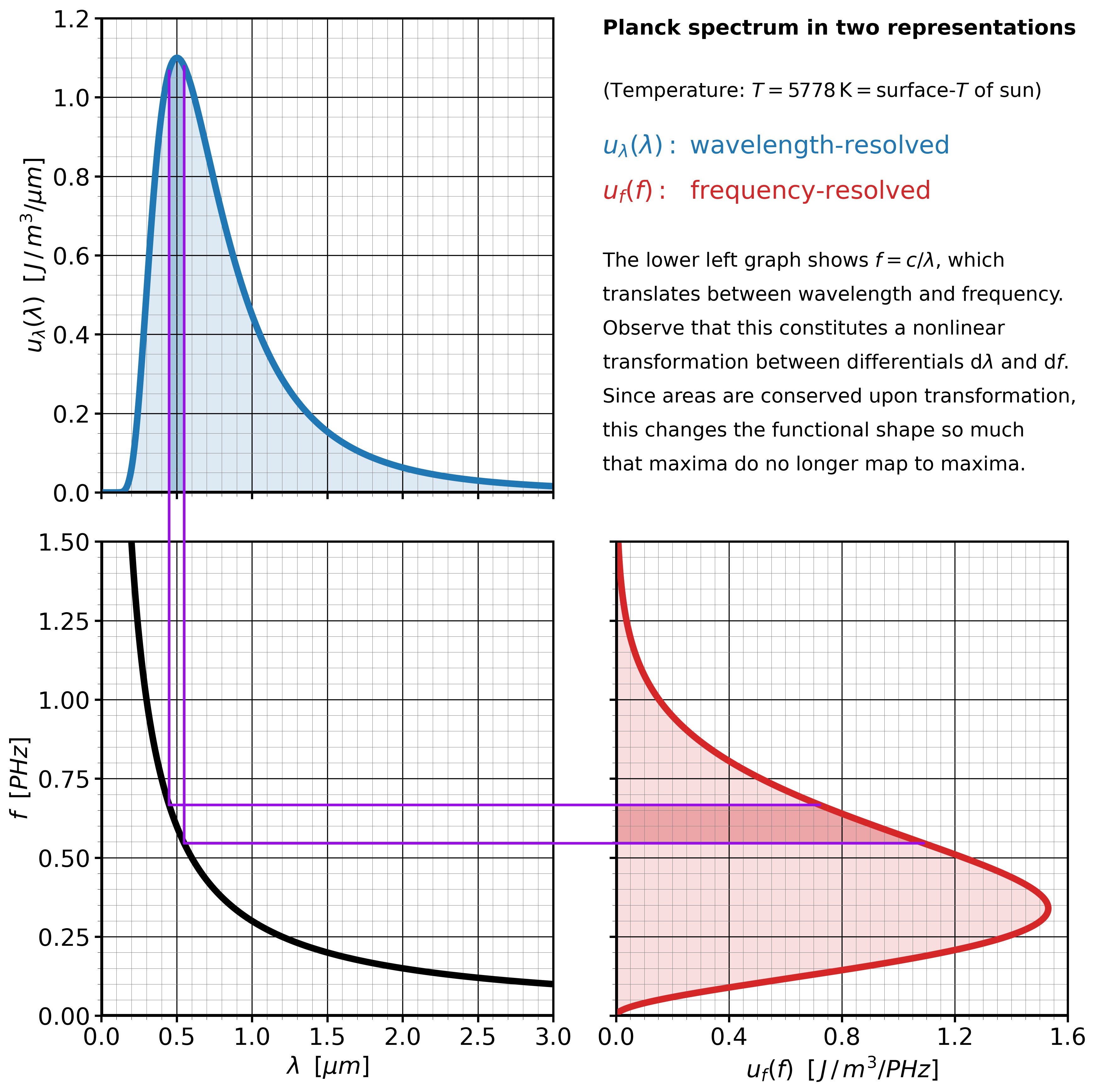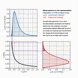 Αυτή η ‘ολοκληρωμένη’ ενεργειακή πυκνότητα είναι που έχει φυσική αξία. Αυτή πρέπει να «διατηρείται» κατά τη μετάβαση από το διάγραμμα συναρτήσει του μήκους κύματος στο διάγραμμα συναρτήσει της συχνότητας. Γιαυτό αναφερόμαστε στην ενεργειακή πυκνότητα μέσα σε μια μικροσκοπική φασματική περιοχή.