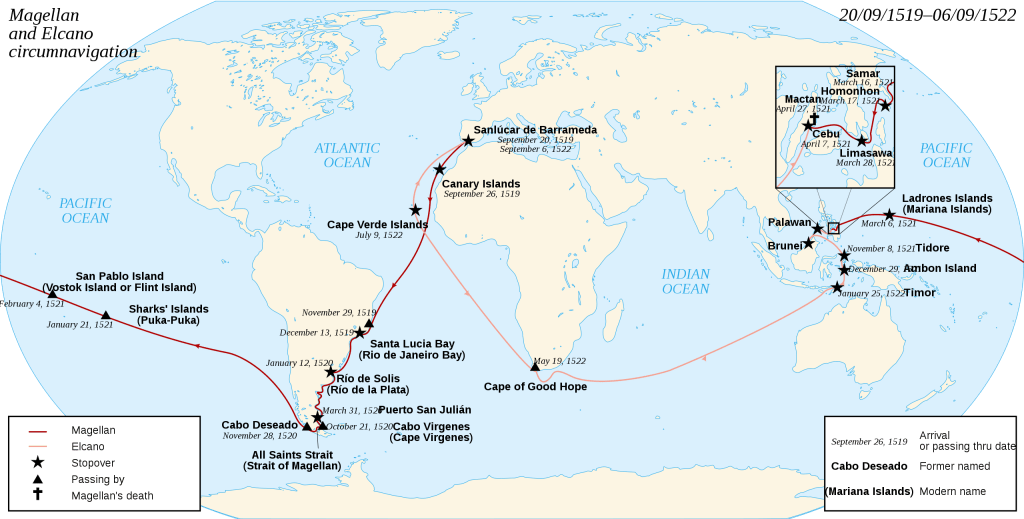 Τον Νοέμβριο του 1520, τα τρία πλοία που είχαν επιζήσει πέρασαν, επιτέλους, στον Ειρηνικό. Τον Μάρτιο του 1521, οι λίγοι εξαθλιωμένοι έπιασαν στεριά: Γκουάμ, έπειτα Φιλιππίνες. Εκεί χάθηκε ο Μαγγελάνος, ο οποίος είχε βαλθεί να αποδείξει ότι η Γη είναι στρογγυλή. Οι ντόπιοι επιτέθηκαν. Ο καπετάνιος κομματιάστηκε.