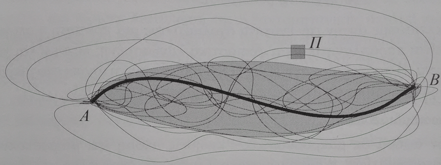 Ένα κυματοσωμάτιο για τη μετακίνησή του από το αρχικό σημείο Α στο τελικό σημείο Β ακολουθεί όχι μία τροχιά (την κλασική, σημειωμένη με την παχύτερη γραμμή), αλλά όλες τις δυνατές τροχιές κάθε μια με διαφορετικό πλάτος πιθανότητας. Θεωρήστε ένα «σωλήνα» με άξονα την κλασική τροχιά και πάχος της τάξης του μήκους κύματος λ (σκιασμένη περιοχή). Η συμβολή των τροχιών που βρίσκονται εκτός του «σωλήνα» είναι πάρα πολύ μικρή, σχεδόν αμελητέα. Επομένως, συμβάλλουν κυρίως οι εντός του τροχιακού σωλήνα τροχιές. Συχνά ο τροχιακός σωλήνας υπό την επίδραση δυνάμεων συστρέφεται και κλείνει στον εαυτό του έτσι ώστε η συνολική έκτασή τους να είναι συγκρίσιμη με το πάχος του (π.χ. σαν μια μικροσκοπική σαμπρέλα). Παίρνει τότε διάφορες διακριτές και συγκεκριμένες μορφές (τα λεγόμενα τροχιακά).