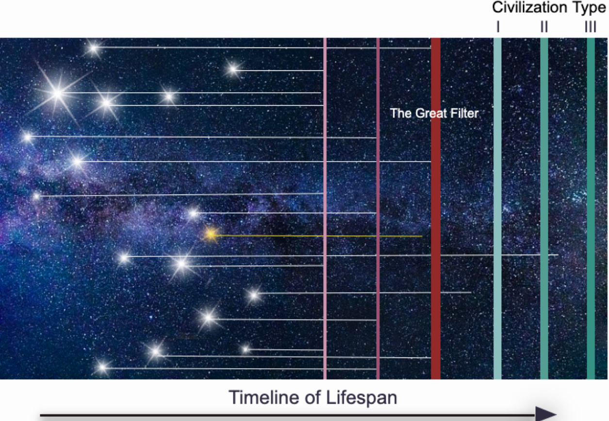 Ένα παράδειγμα χρονοδιαγράμματος πιθανής διάρκειας ζωής για ευφυή ζωή στον γαλαξία. Δεν υπάρχει μοτίβο για το πότε μπορεί να εμφανιστεί η ζωή, αν και υποθέτουμε ότι διάφορα «φίλτρα» όπως φαίνεται στις κάθετες γραμμές μπορεί να έχουν προκαλέσει μαζική εξαφάνιση άλλων πολιτισμών. Ο Ήλιος μας και η κίτρινη γραμμή, είναι μια αναπαράσταση του χρόνου που η ανθρωπότητα κατάφερε να επιβιώσει μέχρι σήμερα. Η ζωή στη Γη έχει ήδη ξεπεράσει τα γεγονότα φιλτραρίσματος, ωστόσο το Μεγάλο Φίλτρο βρίσκεται μπροστά και είναι άγνωστο αν θα μπορέσουμε να επιβιώσουμε ώστε να γίνουμε πολιτισμός Τύπου Ι ή πέρα από αυτόν (πράσινες κάθετες γραμμές). Υπενθυμίζεται ότι ένας πολιτισμός Τύπου I μπορεί να χρησιμοποιήσει το σύνολο της ενέργειας του μητρικού άστρου που φτάνει στον πλανήτη του (την ηλιακή ενέργεια στην περίπτωση της Γης), τα ορυκτά καύσιμα, τα βιο-καύσιμα, την πυρηνική ενέργεια, την γεωθερμική, θαλάσσια και αιολική ενέργεια. Επίσης μπορεί να ελέγχει την θερμοκρασία του πλανήτη, τα έντονα καιρικά φαινόμενα, τη σεισμική και την ηφαιστειακή δραστηριότητα.