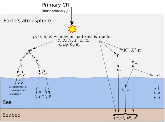 Το πιο διεισδυτικό προϊόν αυτής της διαδικασίας είναι τα μιόνια, τα οποία μπορούν να ανιχνευθούν στην επιφάνεια της Γης αλλά και σε υπόγειους ή υποβρύχιους ανιχνευτές. Για να φτάσουν στον ανιχνευτή KM3NeT/ORCA σε βάθος 2500 μέτρων κάτω από την επιφάνεια της θάλασσας, αυτά τα μιόνια χρειάζονται μια ελάχιστη ενέργεια περίπου 500 GeV στο επίπεδο της θάλασσας και επομένως πρέπει να προέρχονται από πρωτογενείς κοσμικές ακτίνες ενέργειας που υπερβαίνουν πολλά TeV/νουκλεόνιο.