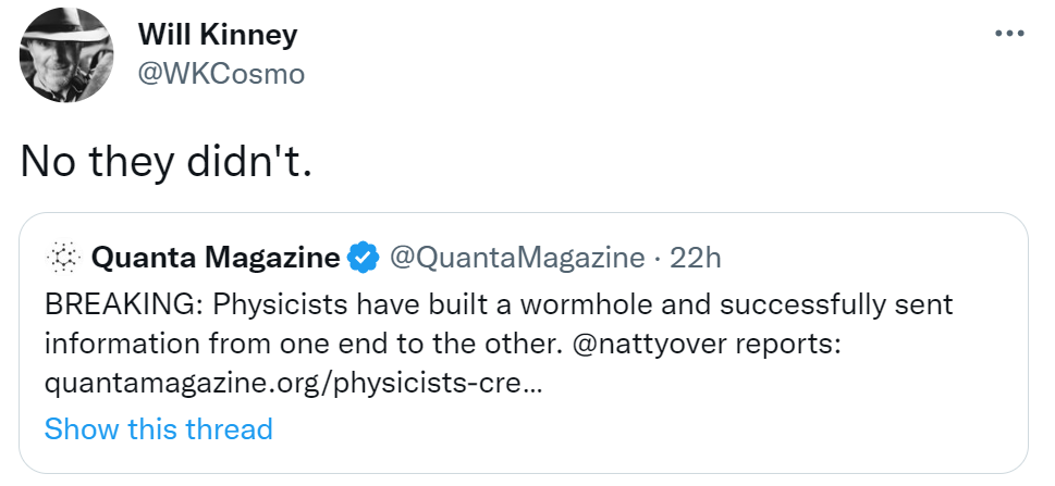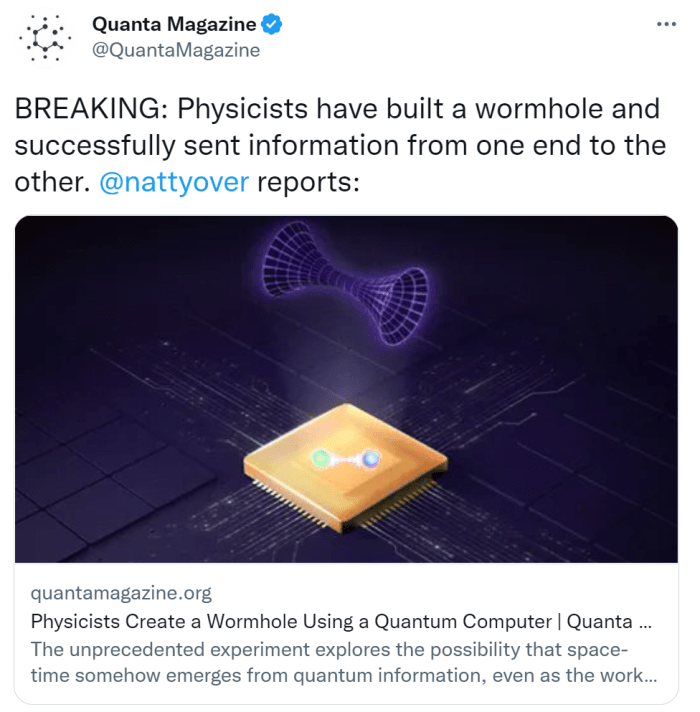 Kατασκεύασαν οι φυσικοί μια σκουληκότρυπα στο εργαστήριο; Σύμφωνα με τον τίτλο του χτεσινού άρθρου ‘Physicists Create a Wormhole Using a Quantum Computer‘ στο περιοδικό quantamagazine, η απάντηση στο ερώτημα είναι καταφατική: οι φυσικοί δημιούργησαν μια σκουληκότρυπα χρησιμοποιώντας έναν κβαντικό υπολογιστή της Google, στέλνοντας με επιτυχία πληροφορίες από το ένα άκρο της στο άλλο!