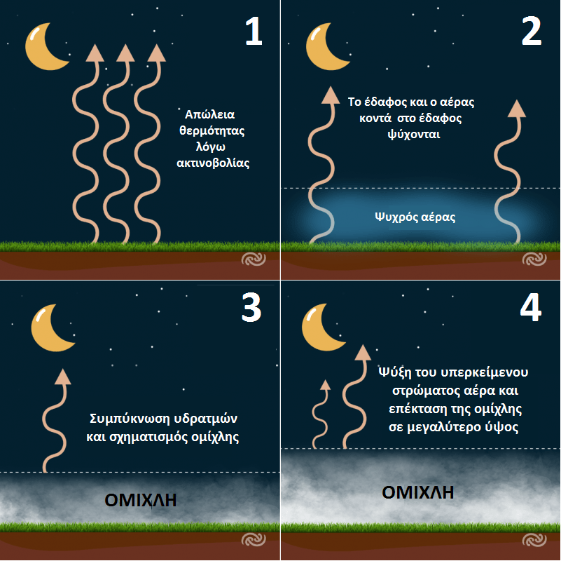Οι αντικυκλωνικές συνθήκες και η απουσία ισχυρών ανέμων που επικρατούν στα Βαλκάνια και στην Ελλάδα, ευνοούν τον σχηματισμό οµίχλης ακτινοβολίας κυρίως σε λεκανοπέδια και οροπέδια τις πρώτες πρωινές ώρες. Η οµίχλη ακτινοβολίας δηµιουργείται τις βραδινές ώρες εξαιτίας της ψύξης της επιφάνειας της Γης (λόγω ακτινοβολίας θερμότητας στο διάστημα) καθώς ψύχεται και ο υπερκείµενος του εδάφους αέρας που περιέχει υδρατμούς, και η ψύξη του υγρού αέρα οδηγεί σε συμπυκνώσεις (ομίχλη).