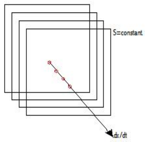Για την λύση επιπέδου κύματος S(x,t)=kx- \omega t η εξίσωση (2) δίνει την (1). Αλλά η εξ. (2) έχει νόημα για οποιαδήποτε \Psi (x,t). Με μια διαφορά: για την γενική κυματοσυνάρτηση \Psi (x,t) η κλίση της φάσης \dfrac{\partial S}{\partial x} είναι συνάρτηση των x και t. Πού ακριβώς πρέπει να αποδώσουμε την ταχύτητα του σωματιδίου; Η προφανής απάντηση είναι: στην πραγματική θέση X(t) του σωματιδίου!