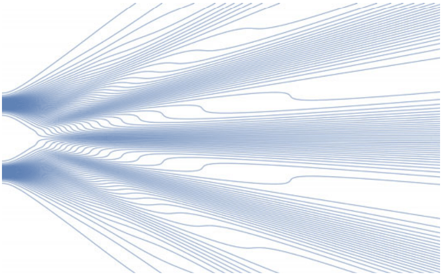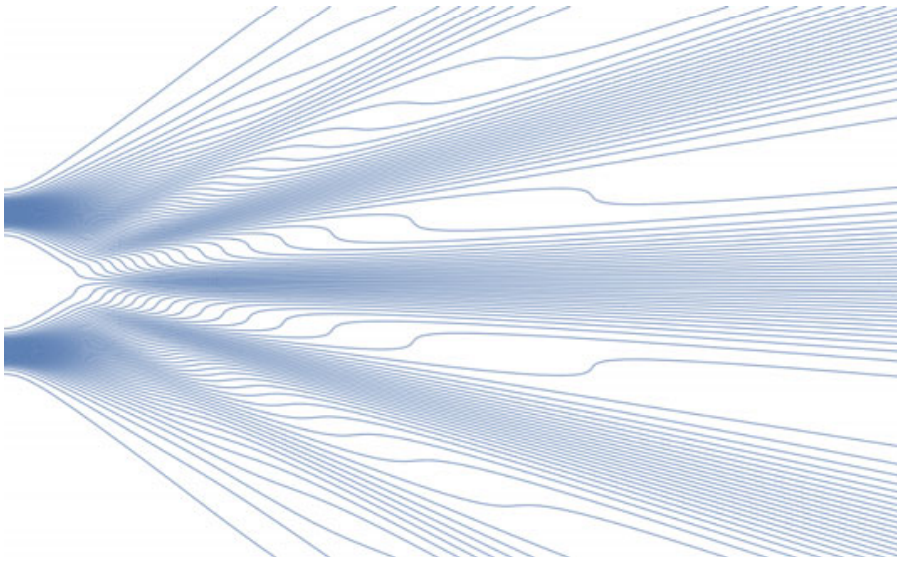 Oι Φιλιππίδης, Dewdney και Hiley, στην δημοσίευσή τους με τίτλο «Quantum interference and the quantum potential«, (1979,  Il Nuovo Cimento B, vol. 52), εφάρμοσαν την θεωρία de Broglie-Bohm για να υπολογίσουν τις τροχιές των ηλεκτρονίων στο πείραμα των δυο σχισμών. Παρατηρείστε ότι καμία από τις τροχιές δεν διασχίζει το επίπεδο συμμετρίας ανάμεσα στις δυο σχισμές. Αυτό σημαίνει ότι όλα τα σωματίδια που παρατηρούνται στο κάτω ή πάνω μισό της δεύτερης οθόνης προέρχονται αντίστοιχα από την κάτω ή πάνω σχισμή.