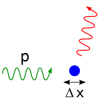 Όμως τα φωτόνια εκτός από ενέργεια E=hf=\dfrac{hc}{\lambda} διαθέτουν και ορμή p=\dfrac{hf}{c}=\dfrac{h}{\lambda} , (h η σταθερά του Planck). Έτσι, για να εντοπίσουμε τη θέση του πυρήνα μέσα στο εύρος Δx, χρειαζόμαστε φωτόνια με μήκος κύματος λ τόσο μικρό, τουλάχιστον όσο το Δx, δηλαδή \lambda =\dfrac{h}{p} \sim \Delta x   \,\,\,\, (1)