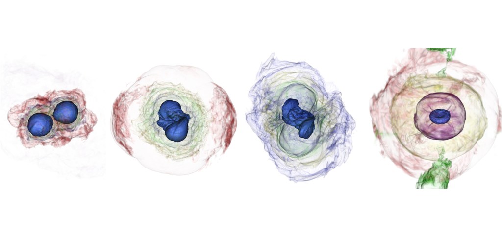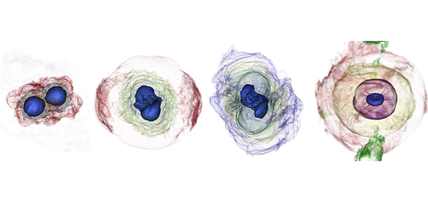 Η παραπάνω εικόνα δείχνει τα τέσσερα στάδια της προσομοίωσης των Combi και Siegel, από την στιγμή λίγο πριν την σύγκρουση των άστρων νετρονίων, όταν η αμοιβαία βαρύτητα τους τα παραμορφώνει δίνοντάς τους το σχήμα δακρύων, έως το αποτέλεσμα της συγχώνευσης όταν ένας δίσκος προσαύξησης τροφοδοτεί το μοναδικό άστρο που απομένει.