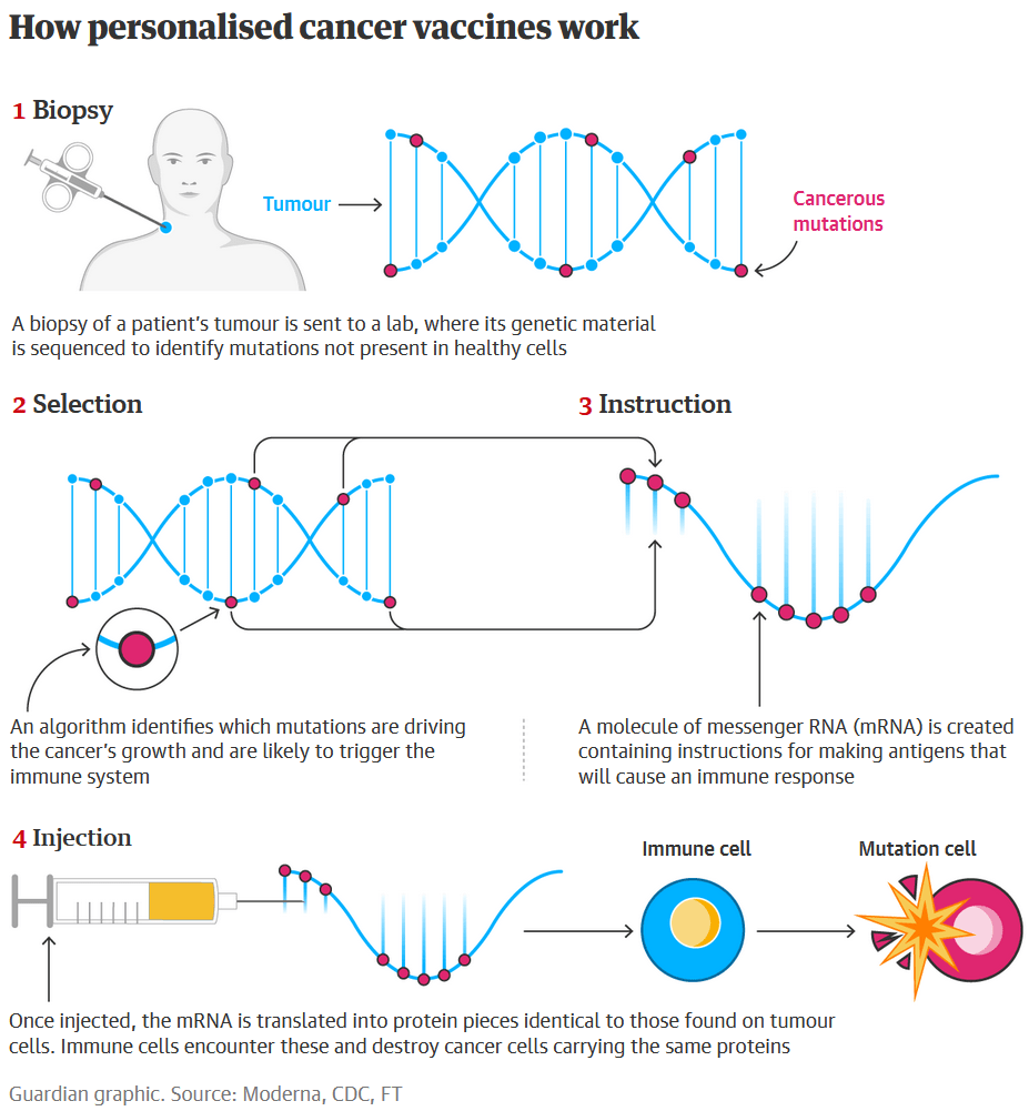 Ο Δρ Πολ Μπέρτον, επικεφαλής ιατρός της Moderna, δήλωσε ότι η εταιρεία θα είναι σε θέση να προσφέρει τέτοιες θεραπείες για «όλα τα είδη των ασθενειών» σε μόλις πέντε χρόνια. Η εταιρεία, η οποία δημιούργησε ένα κορυφαίο εμβόλιο για τον κορονοϊό, αναπτύσσει εμβόλια για τον καρκίνο που στοχεύουν σε διάφορους τύπους όγκων.