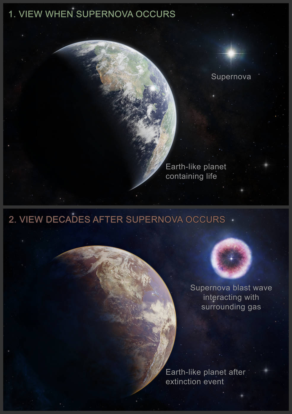 Όμως παρά το τεράστιο χρονικό διάστημα που απαιτείται για να αναπτυχθεί η ζωή σε έναν κατοικίσιμο πλανήτη (όπως η Γη), θα μπορούσε να αφανιστεί απότομα εξαιτίας πάλι μιας έκρηξης σουπερνόβα και των ακτίνων Χ που εκπέμπει. Ακόμα κι αν ο πλανήτης απέχει πάνω από 100 έτη φωτός από το σουπερνόβα!