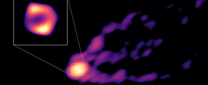 Η νέα εικόνα δείχνει για πρώτη φορά ακριβώς αυτό: πώς η βάση ενός πίδακα συνδέεται με την ύλη που στροβιλίζεται γύρω από μια υπερμεγέθη μαύρη τρύπα εξίμισι δισεκατομμύρια φορές μεγαλύτερης μάζας από τον Ήλιο. Η μαύρη τρύπα βρίσκεται στον γαλαξία Μ87, σε απόσταση 55 εκατομμύρια έτη φωτός μακριά μας.