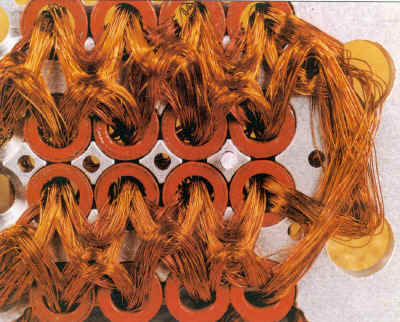 Την ίδια λογική διάτρητων καρτών βρίσκουμε σε νέο ρόλο στη χαραυγή της εποχής των ηλεκτρονικών υπολογιστών. Με πανομοιότυπη φιλοσοφία, ένα πρόγραμμα γραφόταν ως μία σειρά διάτρητων καρτών, με τις οπές να και τα άθικτα σημεία να κωδικοποιούν το πρόγραμμα ως μια σειρά “1” και “0”, δηλαδή την κοινή μεταξύ όλων των υπολογιστών γλώσσα. Η σύνδεση όμως του πλεξίματος με τους υπολογιστές δε σταματά εδώ. Οι πρώτες εκδοχές της μνήμης των ηλεκτρονικών υπολογιστών αποτελούνταν από μεταλλικά στοιχεία περασμένα σε ένα πλέγμα καλωδίων. Δεν έμοιαζαν απλά με πλεκτό, αλλά ήταν επί της ουσίας: η NASA είχε προσλάβει μέσω της Raytheon πρώην εργάτριες της υφαντουργίας, ώστε με την εμπειρία που διέθεταν να “πλέξουν” τη μνήμη που χρησιμοποιήθηκε στα οχήματα του προγράμματος Apollo [α, β].