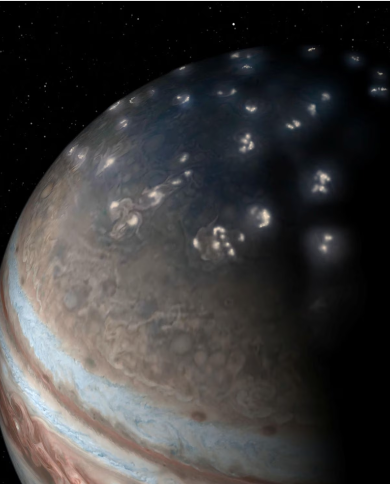 Κάτω από τα καφετιά σύννεφα αμμωνίας που καλύπτουν τον Δία κρύβονται σύννεφα που, όπως και στη Γη, αποτελούνται από νερό. Και όπως και στη Γη, μέσα σε αυτά τα σύννεφα δημιουργούνται συχνά αστραπές – ένα απόκοσμο θέαμα που εντοπίστηκε από διάφορα διαστημικά σκάφη που έχουν επισκεφθεί τον μεγαλύτερο πλανήτη του ηλιακού μας συστήματος, συμπεριλαμβανομένου του σκάφους Juno της NASA.