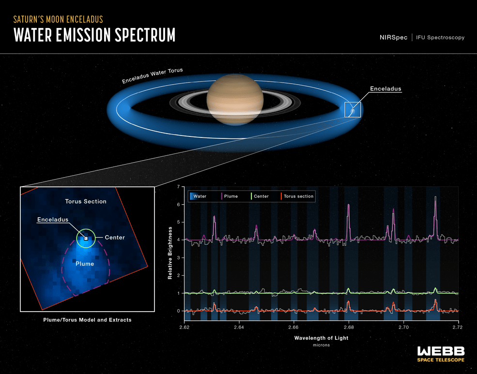 Με ανακοίνωση της η NASA παρουσιάζει πιο αναλυτικά αυτή την ανακάλυψη. Πρόκειται για ένα πίδακα που εκτοξεύει κυρίως υδρατμούς από το εσωτερικό του Εγκέλαδου σε απόσταση δέκα χιλιάδων χλμ. στο Διάστημα. Εκτιμάται ότι η ποσότητα του νερού που εκτοξεύεται είναι περίπου 300 λίτρα το δευτερόλεπτο. Είμαστε εντυπωσιασμένοι από το μέγεθος του πίδακα. Όταν εντοπίστηκε δεν είμασταν σίγουροι για το τι μπορούμε να περιμένουμε να δούμε» αναφέρει ο Τζερόνιμο Βιλανέβα επιστήμονας του Διαστημικού Κέντρου Πτήσης Goddard της NASA, επικεφαλής της επιστημονικής ομάδας που μελέτησε τα δεδομένα που κατέγραψε το James Webb.