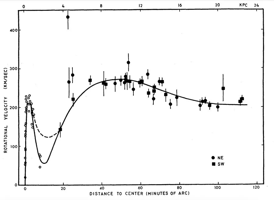 Ενώ η καμπύλη των ταχυτήτων συναρτήσει της απόστασης από το κέντρο του γαλαξία θα έπρεπε «πέφτει», η καμπύλη της Rubin έδειχνε ότι οι τροχιακές ταχύτητες των άστρων μακριά από το κέντρο του γαλαξία δεν μειώνονταν. Ήταν σαν ο γαλαξίας να περιείχε αόρατη μάζα, η οποία διατηρούσε τις τροχιακές ταχύτητες σταθερές. Η Rubin σκέφτηκε ότι πρέπει να υπάρχει κάποιος μηχανισμός για την επιτάχυνση των άστρων που κινούνται πολύ αργά ή την επιβράδυνση των άστρων που κινούνται πολύ γρήγορα.