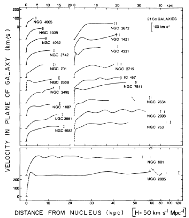 Μεταξύ 1976 και 1986, οι Rubin και Ford διερεύνησαν κι άλλους σπειροειδείς γαλαξίες. Δημοσίευσαν σχεδόν 50 εργασίες κατά τη διάρκεια αυτής της περιόδου. Όμως το πιο σημαντικό και επιδραστικό άρθρο δημοσιεύθηκε στο τεύχος Ιουνίου 1980 του περιοδικού Astrophysical Journal. Εκεί περιέχονταν οι καμπύλες περιστροφής 21 σπειροειδών γαλαξιών, διαφόρων μεγεθών και φωτεινοτήτων. Όλες τους έμοιαζαν με την παραπάνω καμπύλη του γαλαξία της Ανδρομέδας. Οι τροχιακές ταχύτητες των άστρων αντί να μειώνονται καθώς απομακρυνόμαστε από τα κέντρα των γαλαξιών, παρέμεναν σταθερές. Το συμπέρασμα ήταν αναπόφευκτο: στους γαλαξίες αυτούς υπάρχει επιπλέον μη ορατή ύλη (που δεν εκπέμπει ηλεκτρομαγνητική ακτινοβολία).