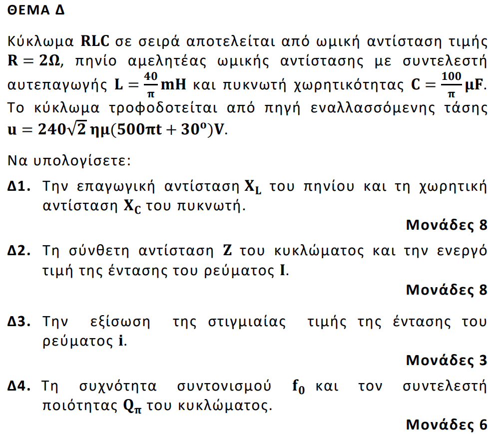 Δ2. Αφού έχουμε συντονισμό Z=R=2 Ω. Eπίσης Ι0=V0/R=120√2 A και Iεν=120Α.
