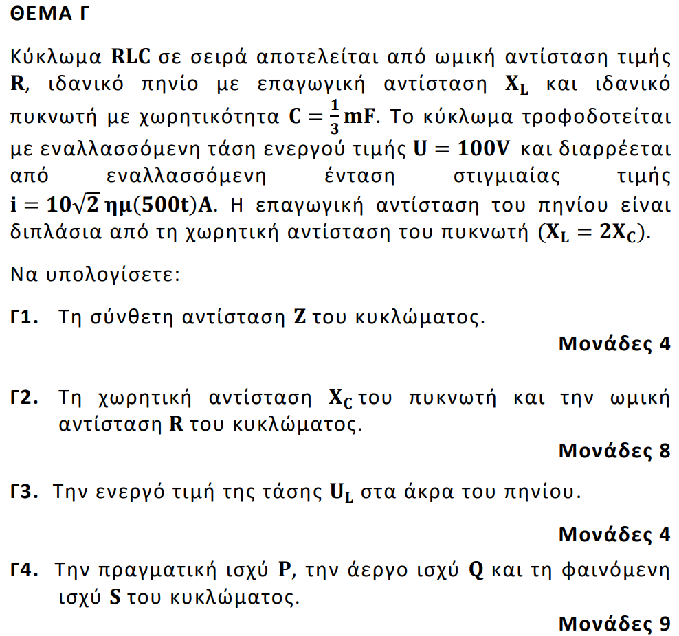 Γ2. Ισχύουν xC=1/Cω=6Ω και xL=2xC=12Ω. Eπομένως z^{2}=R^{2}+(x_{L}-x_{C})^{2} \rightarrow 100=R^{2}+(12-6)^{2}, απ’ όπου προκύπτει ότι R=8Ω