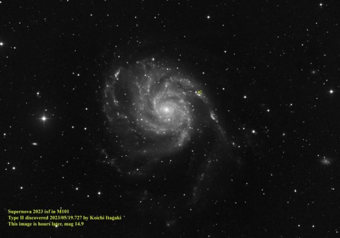 Το σουπερνόβα ονομάζεται SN 2023ixf και εντοπίστηκε για πρώτη φορά από τον ερασιτέχνη αστρονόμο Koichi Itagaki στις 19 Μαΐου 2023. Βρίσκεται σε έναν βραχίονα του γαλαξία Messier 101, που βρίσκεται στον αστερισμό της Μεγάλης Άρκτου, σε απόσταση 21 εκατομμυρίων ετών φωτός από τη Γη.
