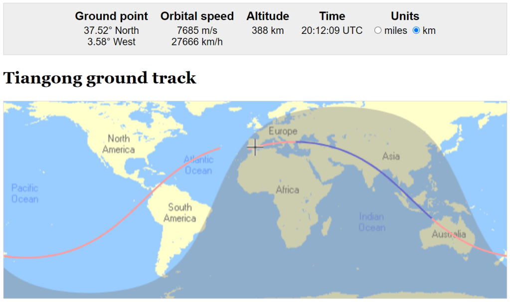 Πράγματι, αυτές τις ημέρες ο διαστημικός σταθμός Tiangong περνάει πάνω από την Ελλάδα, όπως μας πληροφορεί η ιστοσελίδα astroviewer.net, στην οποία μπορούμε να παρακολουθούμε την θέση του Tiangong σε κάθε χρονική στιγμή: