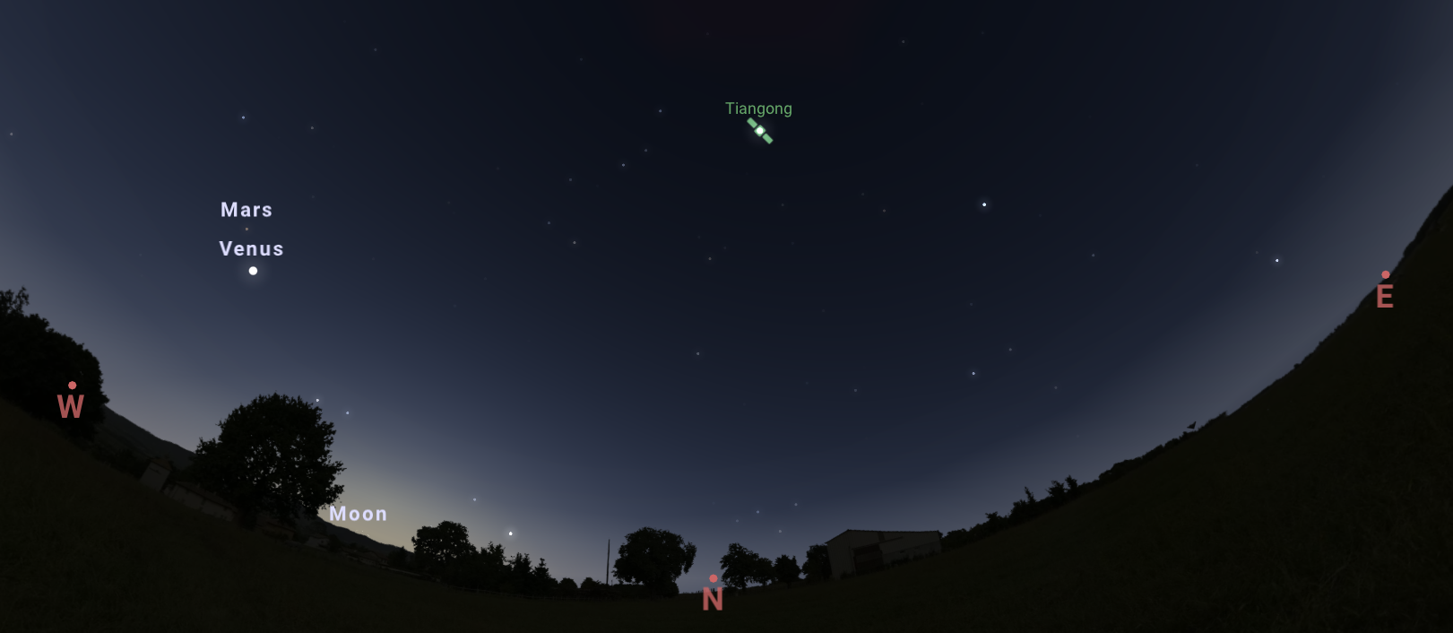 Κι αν εμπιστευτούμε το stellarium-web.org τότε θα μπορέσουμε να δούμε ξάνα τον κινεζικό διαστημικό σταθμό σήμερα 19 Ιουνίου 2023, λίγο μετά τις 10 μ.μ.: