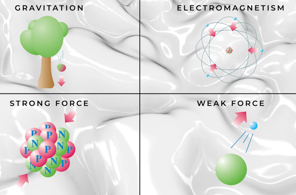 H βαρυτική δύναμη περιγράφεται ως η ελκτική δύναμη μεταξύ δυο μαζών, η ηλεκτρική ως η δύναμη με την οποία έλκονται ή απωθούνται δυο ηλεκτρικά φορτία και η μαγνητική η δύναμη μεταξύ των μαγνητών,ενώ η ισχυρή πυρηνική δύναμη αναφέρεται ως η δύναμη που συγκρατεί ενωμένα τα πρωτόνια και τα νετρόνια στον πυρήνα του ατόμου.