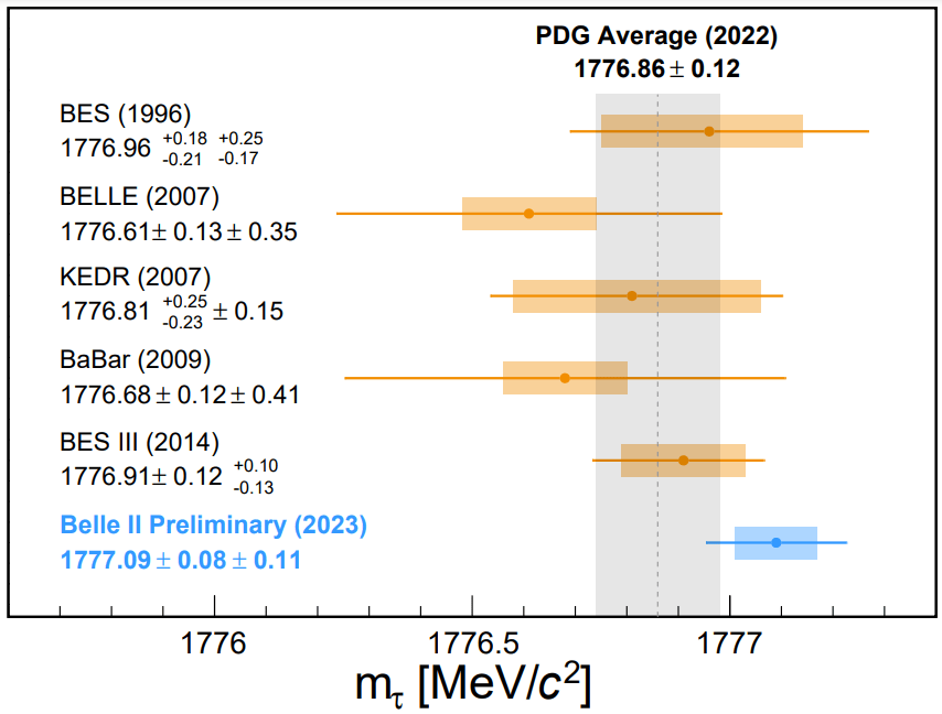 Το πείραμα Belle II πραγματοποίησε την ακριβέστερη μέχρι σήμερα μέτρηση της μάζας του λεπτονίου τ. Στην δημοσίευση με τίτλο «Measurement of the τ-lepton mass with the Belle~II experiment» παρουσιάζεται μια μέτρηση της μάζας λεπτονίου τ που βασίστηκε σε ένα σύνολο περίπου 175 εκατομμυρίων γεγονότων της αντίδρασης e+e−→τ+τ− που συλλέχθηκαν με τον ανιχνευτή Belle II στον επιταχυντή SuperKEKB όπου πραγματοποιήθηκαν οι συγκρούσεις e+e− σε ενέργεια κέντρου μάζας 10,579 GeV. Η μάζα του λεπτονίου τ που μετρήθηκε είναι: mτ = 1777,09 ± 0,08 ± 0,11 MeV/c2 όπου το πρώτο σφάλμα είναι το στατιστικό και το δεύτερο το συστηματικό. Επομένως, mτ =1777,09 ± 0,14 MeV/c2.
