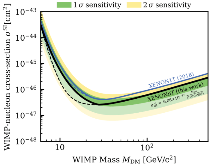 το πείραμα XENONnT έθεσε ως ελάχιστο πάνω όριο στην ενεργό διατομή WIMP-νουκλεονίου την τιμή: 2,58×10−47 cm2 για WIMP με μάζα 28 GeV/c2 :