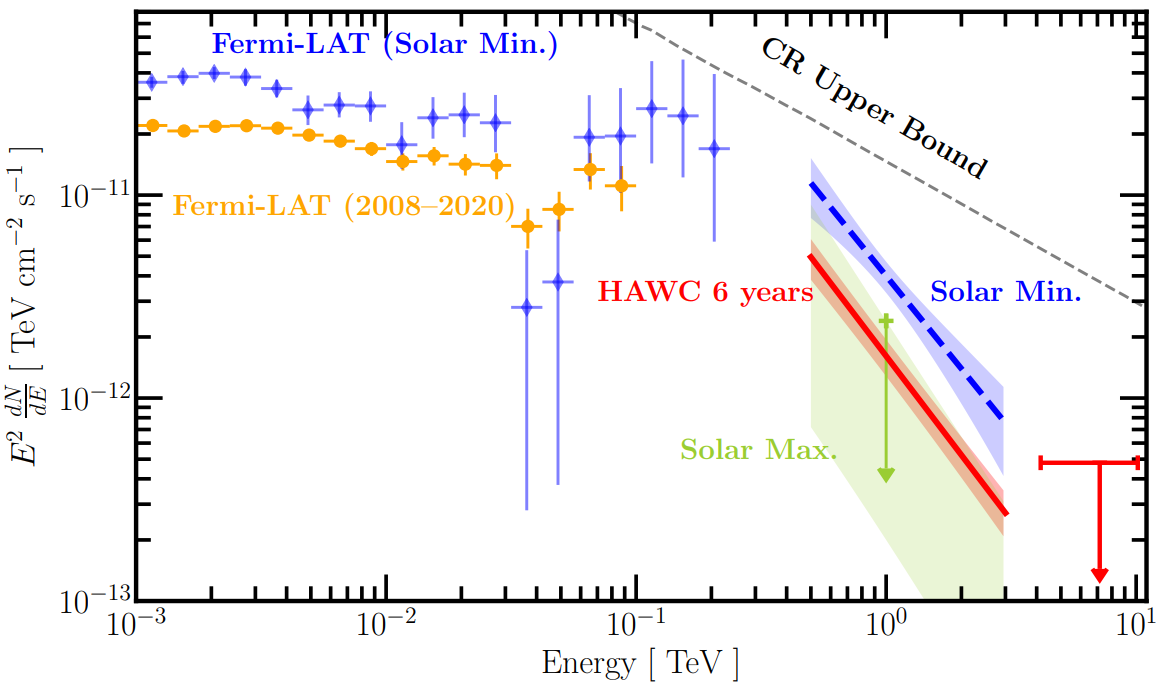 Το πείραμα HAWC παρουσιάζει την πρώτη ανίχνευση ακτίνων γάμμα από τον Ήλιο, με ενέργειες TeV, ένα εύρημα που βασίζεται σε δεδομένα έξι και πλέον ετών. Η ροή τους είναι πολύ υψηλότερη από την προβλεπόμενη, υποδεικνύοντας ότι οι αλληλεπιδράσεις μεταξύ των κοσμικών ακτίνων και της ηλιακής ατμόσφαιρας είναι εξαιρετικά αποδοτικές στην παραγωγή ακτίνων γάμμα. Επιπλέον, η ροή ακτίνων γάμμα TeV ποικίλλει αντιστρόφως ανάλογα με το επίπεδο της ηλιακής δραστηριότητας, υποδηλώνοντας ότι το μαγνητικό πεδίο του Ήλιου επηρεάζει τη ροή – ένα αποτέλεσμα που θα είναι χρήσιμο στην δημιουργία θεωρητικων μοντέλων.