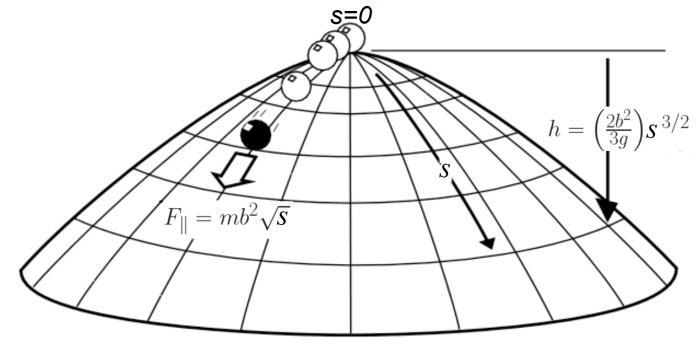 Στο ίδιο συμπέρασμα θα καταλήξουμε αν εφαρμόσουμε τους νόμους της κλασσικής νευτώνειας φυσικής. Έτσι, αν το σημειακό σωματίδιο μάζας m γλιστρά πάνω στην ημισφαιρική επιφάνεια η εξίσωση της θέσης του ικανοποιεί την εξίσωση: