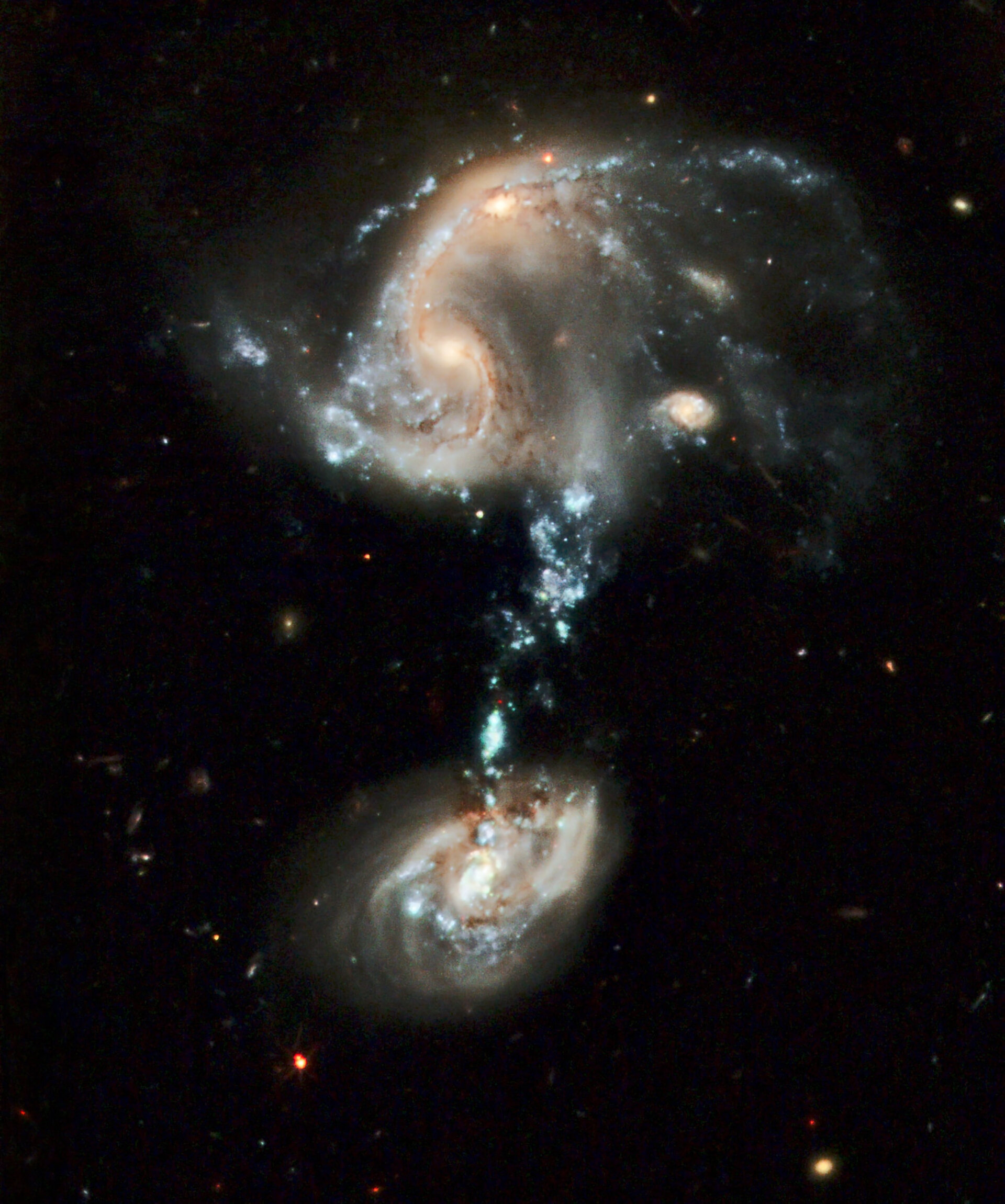 Μια τέτοια περίπτωση αποτελούν οι γαλαξίες Κεραίες (Antennae), ένα ζεύγος αλληλεπιδρώντων γαλαξιών στον αστερισμό Κόρακα, που μοιάζουν επίσης με ερωτηματικό: